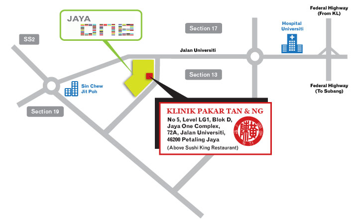 We are located at Block D, Jaya One. Park your vehicles at P1 or P2, search for Block D. Proceed to lift and press P1. We are located at level P1, next to Clip Tips Hair Saloon and facing the parking lot of P1.